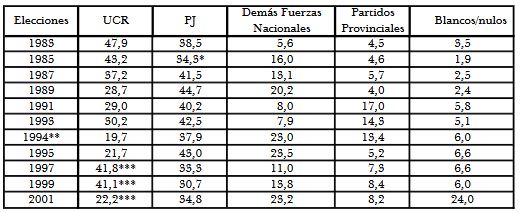 Es importante destacar esos rasgos del sistema electoral porque ellos han influido fuertemente en los problemas de competencia electoral y ejercicio del gobierno con que debieron lidiar los actores partidarios en los últimos años. Concretamente, mientras se intensifica la competencia electoral y el pluralismo de partidos a nivel nacional -respecto de esta tendencia y la desidentificación partidista del electorado ver Adrogué y Armesto, 2001- sucede lo contrario a niveles locales. Aquel incremento de la competencia y el pluralismo ha tenido una víctima privilegiada, el radicalismo, que desde mediados de los noventa ya no encarna una potencial mayoría alternativa al peronismo. Como consecuencia, se ha vuelto crecientemente difícil coaligar a las distintas corrientes de opinión no peronista que tienden, ahora, a expresarse a través de fuerzas más hacia la derecha o hacia la izquierda de la UCR. Éstas encuentran aún más serias dificultades para consolidar sus ocasionales respaldos electorales y traducirlos en poder institucional y, por lo tanto, tienden a tener un período de vida muy breve.