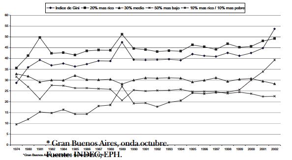 Los acontecimientos de fines de 2001 e inicios de 2002 en Argentina pueden ser interpretados a la luz de las proposiciones formuladas en las secciones precedentes. En un marco de largo plazo de persistente deterioro social y crecimiento sostenido de la concentración de los ingresos (Altimir, et al. 2002, y Gráfico 1), varias políticas gubernamentales agravaron la magnitud y alcances de la crisis económica y la vulnerabilidad financiera y acentuaron su impacto sobre los segmentos medios y más empobrecidos de la población, incluyendo a quienes hasta entonces habían logrado mantenerse relativamente al margen de ellas. De manera abrupta se acentuó el efecto de exclusión social de las políticas económicas ejecutadas por un gobierno nacional que había sido elegido por sus promesas de introducir cambios profundos en el diseño macroeconómico ejecutado a lo largo de los años noventa y en la consiguiente distribución de ganancias y pérdidas. Al agravamiento de las penurias económicas se sumó la frustración de muchas expectativas de cambio político, gestándose condiciones favorables a la explosión social que condujo a la caída del gobierno de Fernando De la Rúa.