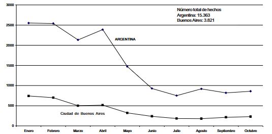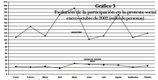 La protesta social alcanzó sus picos de mayor intensidad durante los cinco primeros meses de 2002, para luego descender sostenidamente a pesar de que la condición social de gran parte de los sectores populares y medios continuó degradándose (ver Gráficos 2 y 3)14.