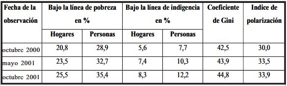 Entre octubre de 2000 y octubre de 2001 la pobreza en hogares creció en el área metropolitana casi 25 por ciento, y la concentración del ingreso, medida por el índice de Gini, subió del 41,2 por ciento en octubre 2000 a 44,8 por ciento en similar mes de 2001 (ver Cuadro 1). Ello en el marco de una recesión que había comenzado a fines de 1998 y que la política económica del gobierno agravó.