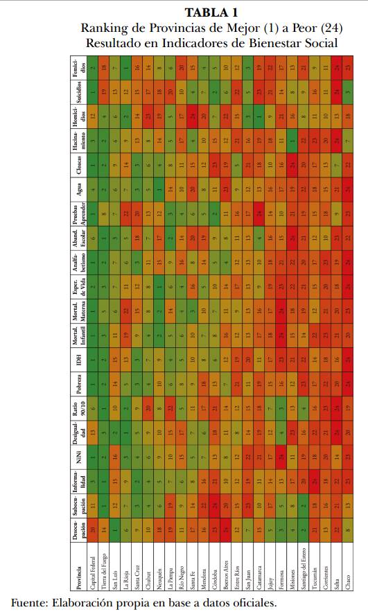 Le siguen en la lista las provincias de San Luis, La Rioja, Santa Cruz, Chubut y Neuquén. Las provincias más pobladas del centro del país, Santa Fe, Mendoza, Córdoba y Buenos Aires tienen valores cercanos al medio de la tabla. Aunque llaman la atención algunos valores: Córdoba tiene muy malos indicadores de empleo, el segundo peor indicador de acceso a cloacas del país, pero mejores indicadores de violencia, sobre todo con relación a Santa Fe, una provincia bastante parecida en términos socioeconómicos y poblacionales. La tasa de homicidios en Córdoba es, en promedio, casi dos veces y media más baja que la de Santa Fe.