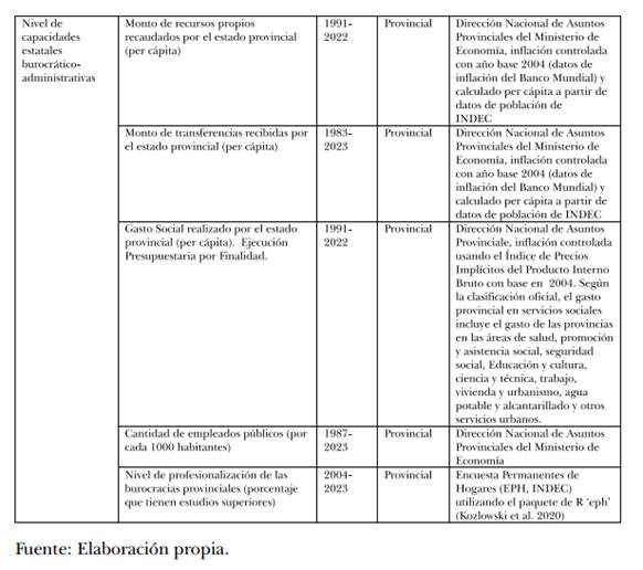 La capacidad en seguridad, fiscal (o capacidad extractiva) y administrativa de las provincias puede ser medida de varias maneras. Las medimos con los mejores indicadores disponibles en series de tiempo lo más largas posibles.