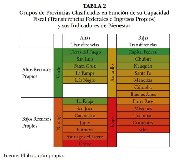 Podemos sostener que el sistema de transferencias federales compensa solo parcialmente algunas de las inequidades en materia de indicadores sociales. Si bien tiende a favorecer a provincias que tienen algunos de los peores resultados en los indicadores sociales seleccionados, como los distritos del noreste y noroeste argentinos, también favorece a otras que tienen algunos de los mejores resultados, como las Patagónicas. Los datos de capacidad fiscal (transferencias nacionales y recursos de origen provincial) nos permiten clasificar a las provincias en cuatro grandes grupos: las que reciben muchas y pocas transferencias federales (divididas a partir de la mitad de la distribución) y las que tienen muchos o pocos ingresos propios (divididas con el mismo criterio) (ver Tabla 2).