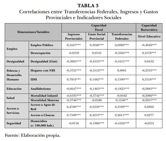Los indicadores de bienestar provincial correlacionan más fuertemente con los de capacidad fiscal provincial (medida con el ingreso y el gasto social provincial) y burocráticas-administrativa (nivel de capacitación de la burocracia). Entre los indicadores de capacidad fiscal provincial, los ingresos totales son los que correlacionan de forma más robusta y negativa con pobreza, analfabetismo y mortalidad infantil; y de manera positiva con los indicadores de desarrollo humano y de acceso a servicios de agua y cloacas. Estos resultados podrían estar indicando que la mejora del bienestar social requiere Estados subnacionales con alta capacidad fiscal y burocrática.