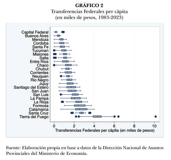 En promedio para la serie 1983-2023, las principales receptoras de transferencias son Tierra del Fuego (4.390 pesos per cápita) y Santa Cruz (2.745), seguidas por Catamarca (2.626), Formosa (2.455) y La Rioja (2.380) (en valores constantes de acuerdo con datos de inflación del Banco Mundial, base 2004=1). En el otro extremo de la distribución, las provincias que menos transferencias federales per cápita reciben son Capital Federal, Buenos Aires, Mendoza, Córdoba y Santa Fe. Capital Federal recibió, en promedio para la serie, 206 pesos per cápita. Buenos Aires recibió 404, Mendoza 712, Córdoba 747 y Santa Fe 776.