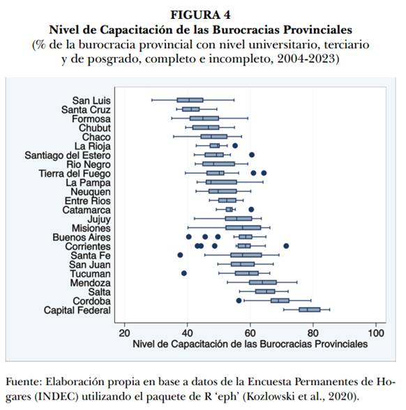 el capital social: confianza al interior de la burocracia, sentido compartido de misión y respecto de la lealtad de los demás. No tenemos estos indicadores sobre la burocracia o la administración pública, pero podrían usarse datos de capital social de las provincias como un argumento alternativo al de capacidad estatal;
