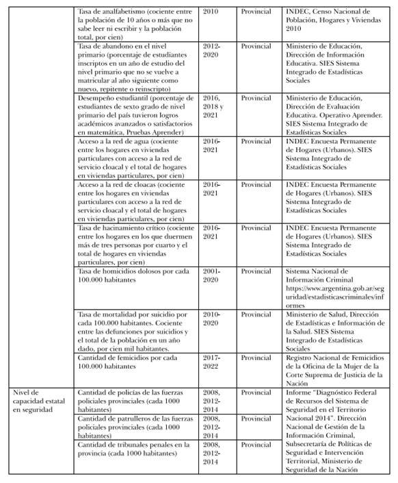 En síntesis, las provincias no tienen el monopolio de la violencia (y de la capacidad destructiva, incluso constitucionalmente), sino que colaboran con el Estado nacional en garantizar la seguridad interna y “producir” bienestar, dada la división funcional de la actividad estatal4. Por todo ello, en países federales como Argentina, Brasil o México, y hasta en unitarios descentralizados, como Bolivia y Colombia, el estudio de la capacidad estatal y sus posibles efectos sobre indicadores de bienestar resulta incompleto sin un adecuado análisis del rol que cumplen las provincias y los gobiernos locales. En función de la definición, y siguiendo a la literatura sobre el tema (Soifer, 2008, Luna y Soifer, 2017), proponemos operacionalizar la capacidad estatal provincial a partir de una serie de indicadores que midan distintas dimensiones del concepto: