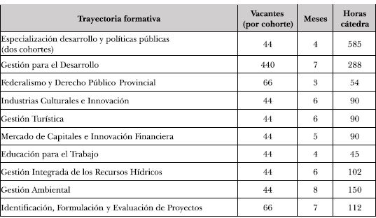 Como parte del despliegue de las diferentes trayectorias, se establece que uno de los objetivos curriculares es que los cursantes realicen el diseño de proyectos e iniciativas de políticas públicas, como así también el diseño de lineamientos para agendas de desarrollo de sus provincias y el montaje de estudios de caso. De igual forma, se prevé avances en la producción conceptual y teórica, lo que es un subproducto casi obvio en todo proceso formativo de las dimensiones y profundidad como el que se está describiendo.