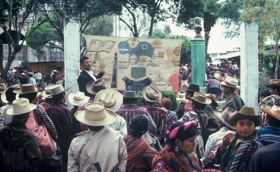 La foto capta la imagen de un predicador evangélico hablando en el mercado semanal. El mercado estaba en plena actividad, colmado de gente. En medio de la gente se encontraba el predicador, parado delante de un gran lienzo pintado a mano que mostraba el cielo y el infierno, el camino de los justos y el de los pecadores, todo ello ilustrado con vivas imágenes y sendas citas bíblicas. Guardé la foto muchos años como algo bello e interesante pero sin captar su significado. Solo tiempo después pude entender que este señor era un verdadero precursor.