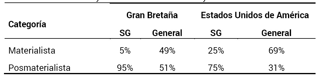 Para reflexionar sobre las demandas, hago referencia a dos conceptos claves que se han usado para entender la demanda de los miembros: materialista y posmaterialista (Iglehart, 1988). Me anticipo diciendo que Iglehart propone estos dos conceptos desde una idea específica de desarrollo. Descubre que existe un cambio de valores en sociedades industriales avanzadas, puesto que si el nivel económico y la seguridad física se cumplen y satisfacen, se observa en la gente un incremento de importancia hacia los valores no-materiales, tal como la libre expresión, la libertad, la participación ciudadana en su comunidad y nación, además de que las ideas se vuelven más valiosas que el dinero; esto porque las necesidades como comida, vivienda han sido solventadas (Iglehart, 1988). Esto también se puede entender con la idea de la sociedad de producción y consumo: los valores materialistas caracterizarían a la primera, mientras los valores posmaterialistas a la de consumo, ya que prefieren la cuestión estética y de libertad (Iglehart, 1988). Entonces, Iglehart propuso una medida para clasificar a países o regiones con valores materialistas o posmaterialistas. Primero presento los resultados de las SGI de Gran Bretaña y Estados Unidos.