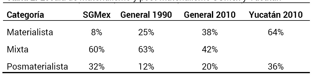 Las diferencias entre estos tres países y el estado de Yucatán son de ambos extremos, pues en los dos primeros países son posmaterialistas, mientras México y los miembros SG de Yucatán son materialistas, estos últimos cualitativamente hablando. La diferencia en las demandas es muy notable. Claramente, este análisis, como vimos, proviene de una teoría en la que se concibe al desarrollo de una manera particular: el éxito económico y material llevan a la preponderancia de las cuestiones no-materiales como la cultura, la libertad y los derechos humanos. El público mexicano y los miembros de la SG de este país continúan con demandas materialistas, ¿por qué aún no tenemos una sociedad industrializada exitosa?