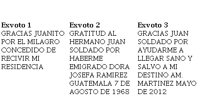 El primer exvoto exhibe a una persona que con la ayuda de Juan Soldado pudo obtener sus documentos para permanecer en Estados Unidos. Para este creyente es tan importante obtener su residencia que lo considera un acto de Dios. El segundo retablo habla de una mujer que agradece al santo su emigración, al parecer, la persona nació en Guatemala en 1968. El mensaje expresa agradecimiento, y posiblemente la creyente regresó a Tijuana para manifestar su gratitud. La palabra hermano muestra que esta persona siente a Juan Soldado como uno de los suyos: un santo igual a sus fieles. El tercer retablo enseña a una persona que adjudica a Juan Soldado el llegar al lugar donde quería, además, protegiéndola de los peligros y manteniéndola con salud.