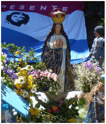 Cuando la Iglesia rionegrina viró definitivamente hacia la “opción por los pobres”, desde la llegada al episcopado de Miguel Hesayne (1975-1993)18, la peregrinación a la gruta de la Virgen de las Nieves perdió fuerza debido al patronazgo militar y su dependencia de la capellanía del regimiento (AHS ARS/BB, Crónicas, 5/8/76, f. 9; 5/08/1976 f. 73). Entonces Hesayne peregrinó con otra advocación mariana que creó como patrona de la diócesis rionegrina: la Virgen Misionera. Esta Virgen, cuya iconografía remite a una campesina pobre con rasgos mapuches, refleja en su rostro el sufrimiento del pueblo (Nicoletti y Barelli, 2012). Esta advocación llegó a Bariloche en el año 1978, de la mano del obispo (El Diario San Carlos de Bariloche, 1978: 1,16,7) y fue elegida para darle el nombre a un barrio del km 7 de la Avenida de los Pioneros19. La parroquia Virgen misionera estuvo a cargo de un cura tercermundista20, Juvenal Currulef21, que emprendió una tarea de viviendas y educación en el barrio de crecimiento exponencial (Agüero, 2007).