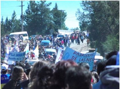En las décadas de 1980 y 1990 comenzaron a llegar los migrantes latinoamericanos no chilenos a Bariloche por el boom de la construcción y crecieron los lugares periféricos de la ciudad (el Frutillar, Levalle, Sara Elflein, 400 viviendas, Cooperativa 258, Bella Vista, Nahuel Hue y San Ceferino (Fuentes, 2007:23). Hacia el interior de la Iglesia rionegrina Hesayne convocó en Viedma un sínodo en 1983-1984, que forjó un programa pastoral desde donde “evangelizar al hombre rionegrino a partir de su realidad iluminada por la verdad sobre Jesucristo” (Hesayne, 1985:3). En ese contexto, el obispo Hesayne se manifestó explícitamente comprometido con los pobres y campesinos. Un ejemplo es la campaña “una oveja para mi hermano” de 1984 y el plan de promoción social (Barelli, 2021). Pero Bariloche seguía su propio ritmo, y la voz del obispo llegaba de forma intermitente sólo a los sectores y barrios relegados de la ciudad en los que trabajaban un grupo de sacerdotes formados por él, como fueron los casos emblemáticos de Juan Ángel Dieuzeide en la “parroquia de los chilenos” y Juvenal Currulef en Virgen Misionera. Desde un movimiento interparroquial impulsado por estos sacerdotes alineados con el pensamiento del obispo, se fueron incorporando a la devoción y a las peregrinaciones de la Virgen de las Nieves elementos propios de religiosidad popular y, de esa línea de pensamiento vinculada a la "opción por los pobres". En esta década la peregrinación pasó del período invernal a la primavera hasta fijarse el último fin de semana de octubre en la década de 1990. Hacia la década de 1980 el crecimiento exponencial de devotos de esta Virgen y su peregrinación buscaron caminos de mayor organicidad e institucionalidad, desde la vicaría andina22. El carácter interparroquial y las comisiones organizadoras de la peregrinación dejaron atrás los eventos y actores locales - el día del Montañés y la Fiesta de la Nieve- y buscaron una participación mayor de la feligresía barilochense.