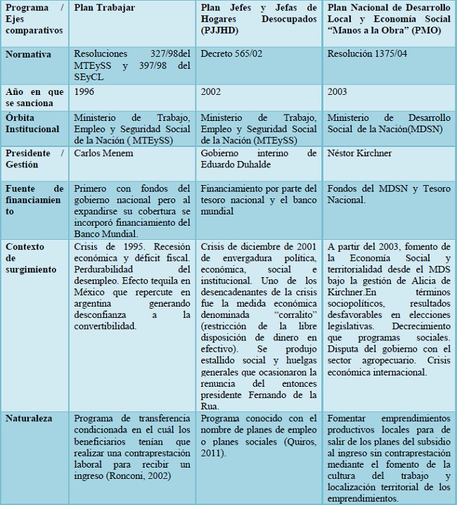 El análisis comienza en la década de 1990 con el “Plan Trabajar” (Resoluciones 327/98 del Ministerio de Trabajo, Empleo y Seguridad Social de la Nación (en adelante MTEySS) y 397/98 del SEyCL), continúa con el “Plan Jefes y Jefas de Hogares Desocupados” (en adelante, PJJHD) sancionado bajo el Decreto 565/02 del período 2001-2002 y, luego con el Plan Nacional de Desarrollo Local y Economía Social “Manos a la Obra” (Resolución 1375/04 -MDSN en adelante, PMO) a partir del año 2003. Finalmente, se sanciona la resolución que le da origen al Prist -At en el año 2009 bajo la órbita del MDSN (Resolución 3182/09).