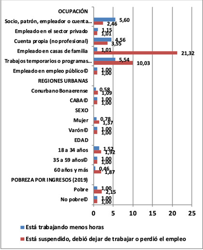 En este apartado se analiza, por medio de una técnica multivariada, la injerencia de factores personales y contextuales en la probabilidad que los ocupados hayan experimentado alguna de estas dos situaciones: “estar trabajando menos horas” o “estar suspendido, haber dejado de trabajar o haber perdido el trabajo”. Se determinan, por medio de un modelo de regresión logística multinomial, 3 las categorías sociales y de la estructura productiva que inciden en estas situaciones en referencia a seguir trabajando o tener licencia por ser parte del grupo de riesgo.
