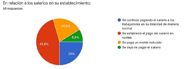 En relación con el pago de salarios, en un 45.6% de los casos se estableció el pago en cuotas. En un 25% de las fábricas el salario de los trabajadores se continuó pagando con normalidad y en un 20.6% se pagó un monto reducido. Finalmente, casi en un 9% se dejaron de pagar los salarios. Es decir, un 75% de las fábricas consideradas en el estudio han afectado el pago de salarios en alguna medida.