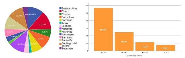 Denominamos barrios y/o comunidades ladrilleras a los territorios donde habitan familias que se dedican a la actividad. Estos territorios pueden a veces ocupar extensiones pequeñas y estar ocupados por cinco o diez familias que se dedican a la actividad y, en otras ocasiones, tener amplias extensiones de tierra en la cual trabajan cien o doscientas familias ladrilleras. En el caso de nuestros datos, en promedio, las comunidades relevadas se componen de cuarenta y siete familias, aunque se observa una amplia dispersión en los datos, habiendo comunidades con menos de diez familias y otras que abarcan a cien, doscientas y hasta quinientas familias. En este marco, la mayor parte de casos que hemos relevado corresponde a comunidades pequeñas y medianas: un 56,5% corresponde a barrios u organizaciones donde viven y trabajan menos de veinte familias, un 24,5% se compone de entre veintiuna y cuarenta familias y en el restante 18,8% la cantidad de familias supera las cuarenta.