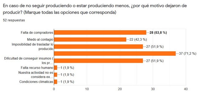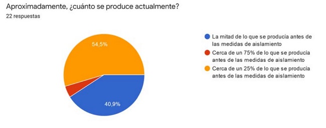 La implementación de medidas de prevención de la propagación del COVID-19, definidas principalmente por el establecimiento del Aislamiento Social Preventivo y Obligatorio a partir del 20 de marzo de 2020, tuvieron un impacto directo sobre la producción en el sector. Como veremos, los principales cambios se vinculan a la paralización de la actividad, aunque también, en los casos de las unidades que continuaron produciendo, se generaron otros problemas, principalmente para concretar operaciones de ventas, obtener insumos o bien para sostener los precios de comercialización previos a la pandemia. En los casos relevados, solo un 2% continuaba produciendo normalmente al momento del relevamiento, es decir, como lo hacía previo a la pandemia. Una importante mayoría, un 56,6% dejó de producir y un 41,5% continuó produciendo, pero en menor cantidad a como lo hacía previamente. En términos generales, quienes continúan produciendo han disminuido fuertemente los niveles de producción: un 40,9% actualmente produce cerca de lo mitad de lo que producía anteriormente y un 54,5% apenas un cuarto en dicha relación. Apenas un 4,6% llega a producir cerca de tres cuartos de lo que producía antes.