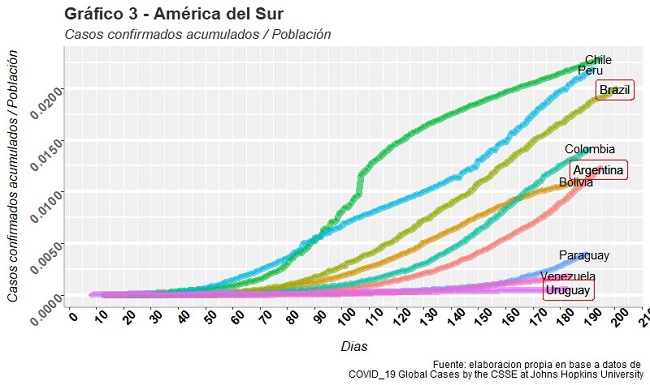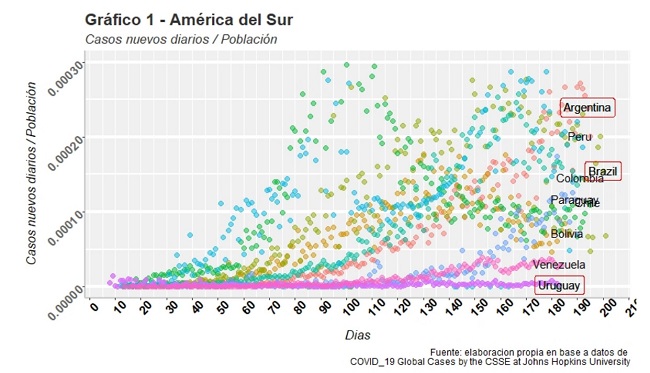 El primer caso de coronavirus en América del sur se registró en Brasil el 26 de febrero de 2020. El 19 de marzo alcanzó a todos los países de la región. En Junio, la región se convirtió en el epicentro de la enfermedad. Los distintos países implementaron distintas estrategias políticas frente a la pandemia del COVID-19. Por ejemplo el caso de Brasil que a mitad de junio superó el millón de casos confirmados y las 50.000 muertes, siendo el segundo país en número de contagios en el mundo. Para mitad de septiembre había superado los 4 millones de contagios y las 100.000 muertes. Perú a mitad de septiembre registró 722.832 casos acumulados y 30.526 muertes. Colombia al 14 de septiembre registró 716.319 casos acumulados y 22.924 muertes. México registró a la misma fecha 668.381 casos acumulados y 70.821 muertes. Otros países en cambio respondieron de forma más rápida, coordinada y lograron mantener contenidos los contagios experimentados en sus países. Uruguay es uno de esos casos que al 14 de septiembre sólo registró 1780 casos acumulados desde el inicio de la pandemia y 45 muertes. Otros países como Argentina o Bolivia, tomaron medidas inmediatas al registrar sus primeros casos de Coronavirus y mantuvieron contenidos los contagios durante los 4 primeros meses, luego de lo cual y quizás por la dificultad de sostener las medidas restrictivas a lo largo de tanto tiempo, comenzaron a evidenciar crecimiento mucho mayores en el número de casos.
