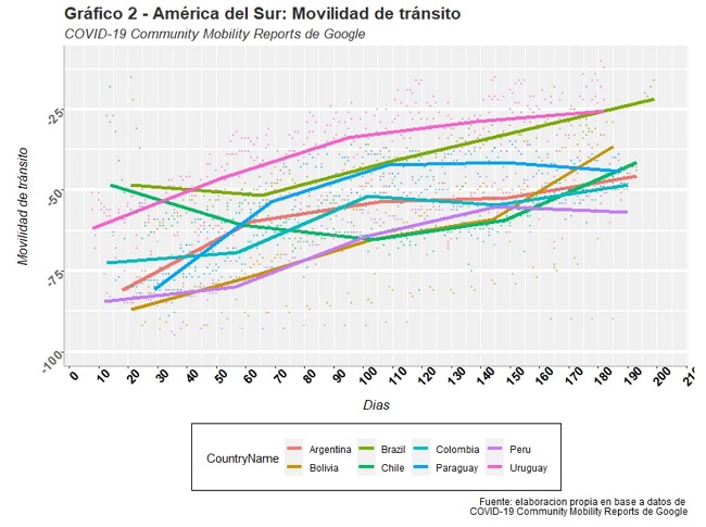 En relación a la movilidad, la tendencia general de los países de América del sur ha sido un brusco descenso al inicio, luego un período donde la estabilidad fue muy baja en casi todos los países en estudio (hasta el día 60 de pandemia). Posteriormente se ve paulatino aumento de la movilidad de todos los países. Uruguay es el país que mantuvo la movilidad más alta a lo largo de todo el período. Bolivia, Chile y Perú son los países que han registrado una movilidad menor a lo largo de la pandemia Entre los países que han registrado una movilidad media se encuentra Argentina y Colombia.