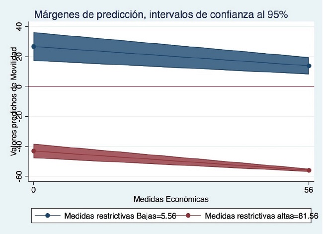 Podemos apreciar que cuando hay mayor valor de medidas económicas, el efecto de las medidas restrictivas reduce aún más la movilidad, que cuando los valores de medidas económicas son bajos. Es decir, en los escenarios con medidas restrictivas bajas, tener más medidas económicas permite reducir la movilidad en 13 punto porcentuales. En un escenario de medidas restrictivas altas, pasar de tener bajas medidas económicas a tener altas medidas económicas permite una reducción de la movilidad de 12 puntos porcentuales. Del gráfico también se desprende que el efecto de las medidas restrictivas es mayor que el de las económicas. En un escenario de medidas económicas bajas, pasar de tener pocas a muchas medidas restrictivas nos lleva de un escenario con un 27 por ciento de movilidad a uno de reducción del 55 por ciento de la movilidad. En un escenario con medidas económicas altas, ese mismo cambio en las medidas restrictivas no permite pasar de una movilidad de 14 puntos porcentuales a otra de reducción del 43 por ciento. El efecto de las medidas restrictivas en la movilidad es muy alto, y es aún mayor cuando tales medidas están acompañadas con medidas económicas.
