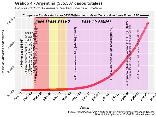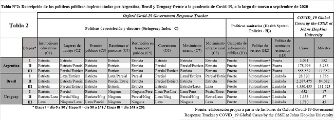 En el caso de Argentina, los primeros casos se registraron a principios del mes de marzo. En cuanto a las medidas restrictivas del gobierno, hubo una política estricta respecto al cierre presencial de las instituciones educativas, a la imposibilidad de concurrir presencialmente a los lugares de trabajo, a la realización de eventos públicos, se prohibieron las reuniones de más de 10 personas, hubo fuertes restricciones en relación al funcionamiento del transporte público, hubo una cuarentena estricta, se redujo fuertemente el movimiento interno. A mitad del mes se dio un cierre parcial de frontera, de vuelos provenientes de áreas afectadas y posteriormente se procedió al cierre total de fronteras. En cuanto a las políticas sanitarias hubo una fuerte campaña de información pública, la política de testeos se basó en los casos con síntomas y hubo una fuerte política de contactos estrechos. En lo referente a las políticas económicas, Argentina fue con Uruguay, uno de los países que más recursos destinó para contener la reducción de la actividad económica y la movilidad de las personas. Por un lado, tres días después de decretar la cuarentena social, solidaria y obligatoria se implementó una compensación menor o igual a 50% de salarios (23 de marzo) de las empresas (REPRO) que perdura hasta la actualidad y, por otro lado, aplicó un congelamiento generalizado de tarifas y de obligaciones financieras desde el 25 de marzo a la actualidad. Finalmente, se planteó un sistema de apertura progresiva de la actividad económica a través de fases que consiste de 5 Fases: I (10 de marzo al 24 de marzo), II (20 de marzo al 13 de abril), III (27 de abril al 10 de mayo), IV (11 de mayo-actualidad) y la V denominada “nueva normalidad” aún no aplicada. Estas fases se fueron implementando de manera diferenciada en cada provincia de acuerdo a la evolución de los contagios registrados y a una serie de criterios epidemiológicos.