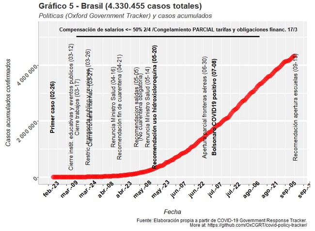 El caso de Brasil, en este momento ya es un caso paradigmático junto a EEUU y Gran Bretaña por la cantidad de contagios alcanzados en poco tiempo. El 26 de febrero se anuncia el primer caso del país y también de la región. La primera política registrada en la base de datos OxCGRT es 3 semanas después con el cierre de instituciones educativas y restricciones a reuniones con más de 10 personas (12 de marzo). A su vez, en relación a los lugares de trabajo en un primer momento se sugirió la realización de tele-trabajo que con el correr de los días se hizo obligatorio. Se mantuvieron de forma parcial y más flexibles la política al funcionamiento del transporte público, la cuarentena, y el cierre de fronteras fue parcial. La política sanitaria seguida desde el gobierno nacional ha sido una estrategia laxa que incluso tensionó el sistema político con algunos estados federales que no acompañaron esa estrategia. Sin embargo, hubo una fuerte política de comunicación, la política de testeo se restringió a personas con síntomas y hubo una limitada política de rastreo de contactos. Como se observa en la tabla 2, sólo se mantuvieron flexibles las políticas respecto a la cuarentena y al transporte público, y respecto a la política de contactos estrechos también continuó siendo limitada. Se pudo ver una importante descoordinación vertical, entre las políticas implementadas desde el gobierno central y los gobiernos estaduales. Incluso en un período de un mes (del 16 de abril al 14 de mayo) el Ministerio de Salud tuvo 3 ministros distintos por diferencias con el presidente. En lo referente a la política económica, la situación sigue la misma lógica ya que, al igual que Chile, a partir del 17 de marzo se implementó un congelamiento parcial de tarifas y obligaciones financieras y 2 semanas después, una compensación del 50% o menor de los salarios.
