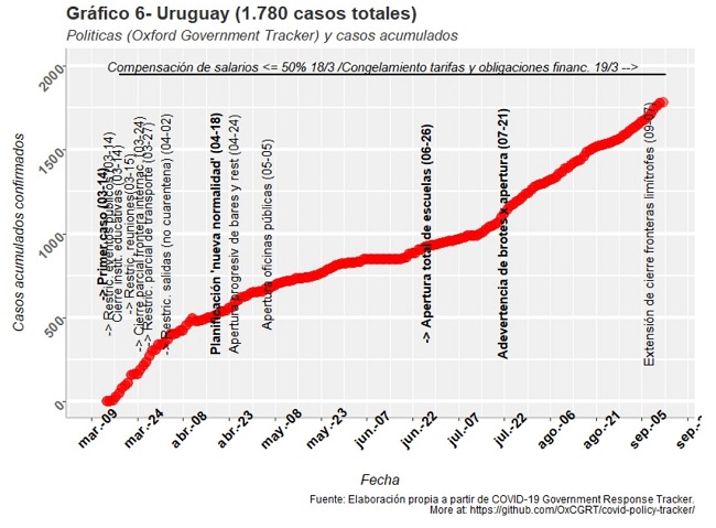 En ese sentido, desde el comienzo de la pandemia donde el gobierno decidió no decretar una cuarentena obligatoria, Uruguay se diferenció rápidamente de los países que sí tomaron esa vía, como Argentina. Pero también se diferencia de aquellos países que minimizaron la pandemia, como Brasil. Y si bien Uruguay se encuentra en septiembre en medio de una recesión económica, el gobierno ha extendido la decisión de mantener el cierre parcial de fronteras internacionales y sostener la emergencia sanitaria a pesar de que una porción grande de su Producto Interno Bruto se compone de la actividad proveniente del turismo internacional. Nuevamente, a pesar de que la mayoría del turismo uruguayo proviene de Argentina, el gobierno decidió no abrir las fronteras.