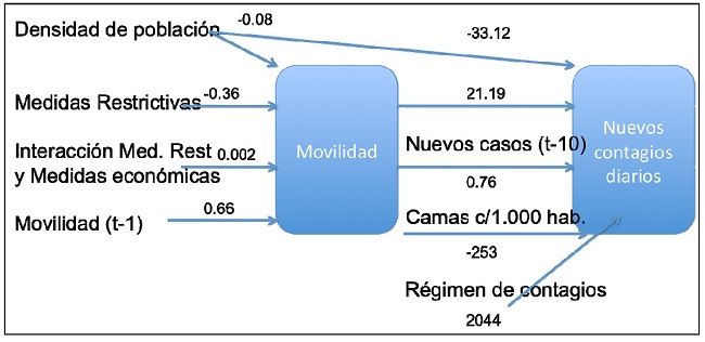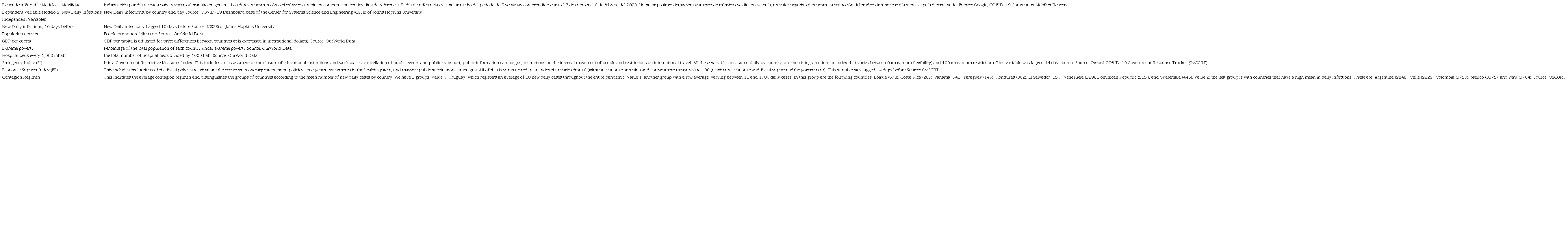 Aquí la variable dependiente son los nuevos casos diarios por día y por país. La variable X1 (t-10)j mide los nuevos contagios diarios de 10 días antes. Esta variable fue incluida para captar el período de incubación de la enfermedad por COVID-19. El bloque de 4 variables sociodemográficas de control fueron incluidas como: X2 tj, X3 tj, X4 tj , X5 tjy registran el efecto de densidad de población, PBI per cápita, pobreza extrema y camas de hospital cada 1000 habitantes. Luego se incluye el efecto de la variable movilidad: X6 tj . Por último se incluye la variable Régimen X7 tj, que permite distinguir el efecto de los 4 grupos de países de acuerdo al promedio de casos diarios registrados. Finalmente hay un término de la sumatoria de los errores e tj.