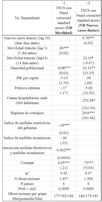 Este trabajo se basa en un análisis de regresión multivariada del tipo Time Series Cross Sectional (Beck and Katz, 1995; Podestá 2002; Stimson 1985). Este tipo de análisis estadísticos tiene la ventaja de poder evaluar simultáneamente el impacto de los distintos tipos de medidas estatales sobre la movilidad y a su vez en el segundo modelo, el impacto de la movilidad sobre los nuevos contagios confirmados por día, distinguiendo la pertenencia a cada país. La base de datos fue fijadas por país y por día de la epidemia (xtset pais dia). Esto es, en lugar de fecha, se fija la base desde el día 1 en que se detectó el primer caso de Coronavirus en cada país, hasta el día 14 de septiembre que es el último registro de nuestra base de datos. El máximo son 200 días de pandemia y el promedio de días es 95 días al interior de los países. Los modelos estimados son Time-series cross-section (TSCS) y se emplea en bases de datos donde tenemos observaciones repetidas (en nuestro caso día de la pandemia) en unidades fijas por grupos (países). A diferencia de los datos de panel, el modelo TSCS se emplea cuando hay muchas observaciones en el tiempo y hay una cantidad de grupos reducidos o medios. El uso de un modelo de regresión lineal múltiple regular para este tipo de datos se vuelve problemático ya que viola varios supuestos de la regresión. Los modelos TSCS en cambio permiten errores correlacionados temporal y espacialmente, y heteroscedasticidad. Para controlar estos problemas se emplean un modelo TSCS, con un método de estimación por OLS con panel corrected Standard errors (Beck and Katz, 1995), que calcula de forma más adecuada los parámetros del modelo, también se aplican transformaciones para controlar la auto-correlación de los datos (se pueden ver los detalles, y diagnósticos en el anexo)[1]. Para controlar la posibilidad de auto-correlación por serie (serial auto- correlation) del tipo AR(1), se incluyó la variable movilidad laggeada 1 día, tal como sugiere Beck and Katz, 1995 y Podestá 2002.