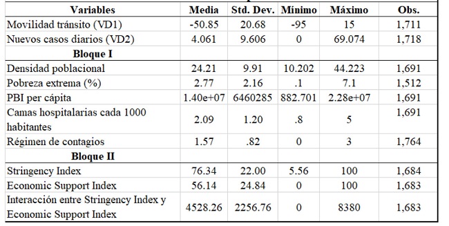 La base de datos contiene información diaria de 8 países de América Latina: Argentina; Bolivia; Brasil, Chile; Colombia; Perú; Paraguay y Uruguay. Ecuador fue excluido porque registraba muchos errores de carga de datos. Venezuela fue excluido del análisis ya que no tiene información sobre pobreza extrema, una de las variables independientes incluidas en el análisis.
