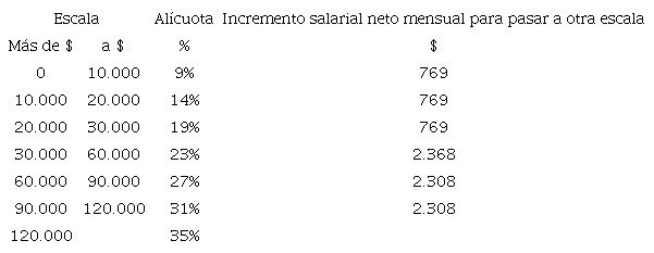 El congelamiento de las escalas, asimismo, implicaba que un trabajador que tributaba en las escalas inferiores, pudiera pasar a pagar en una escala superior con un aumento de al menos $769 mensuales, mientras que en los tramos superiores ese aumento debía superar los $2308 por mes para pasar a una categoría más elevada (Basualdo, et al., 2014).