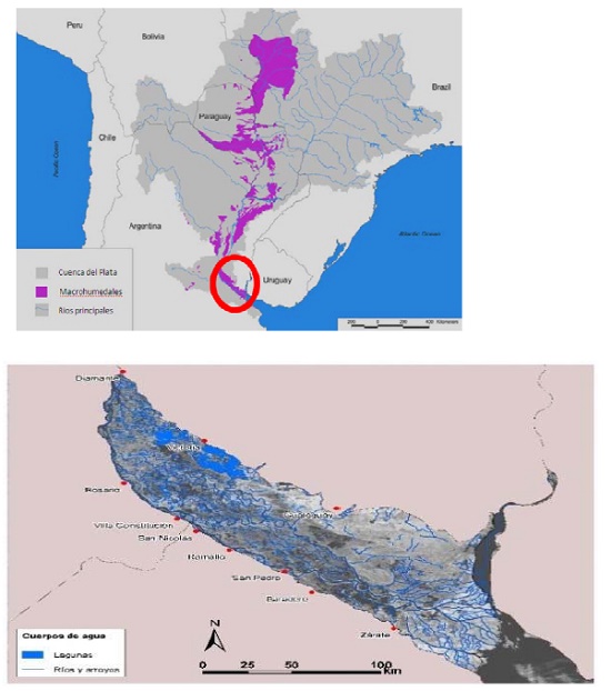 La región del delta del río Paraná comprende el área ubicada desde el sur de la ciudad de Diamante (Entre Ríos) hasta las cercanías de la ciudad Autónoma de Buenos Aires, constituyéndose como la sección terminal de la cuenca del río Paraná. Abarca una superficie aproximada de 17.500 km². El delta se subdivide en 3 áreas: Superior, Medio y el inferior (Malvárez, 1997). El delta Superior se despliega desde el inicio de la región hasta una línea imaginaria que une las ciudades de Victoria (provincia de Entre Ríos) y Rosario (provincia de Santa Fe). El delta Medio se sitúa desde esta línea imaginaria hasta otra línea que une las localidades de Baradero (provincia de Buenos Aires) e Ibicuy (provincia de Entre Ríos). En esa intersección se origina el río Paraná de las Palmas. El delta Inferior es la porción terminal, que desemboca en el río de la Plata (Quintana et al., 2010). (Ver Figura 1)