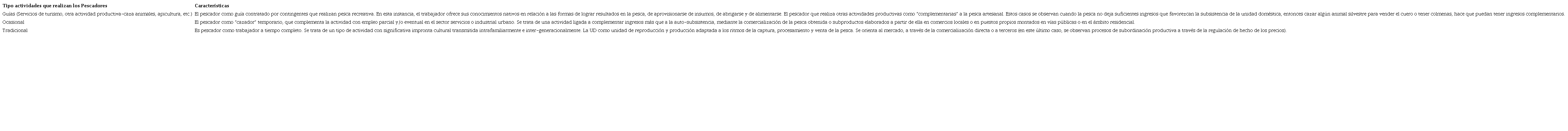 En función del relevamiento realizado in situ, se identificaron diferentes tipos de actividades que realizan los pescadores artesanales, los cuales se clasifican en la tabla 1 que se presenta a continuación.