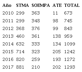 Como ya mencionamos, ATE comenzó en 2003 a afiliar municipales en la ciudad de Azul. En 2005 y 2006 ya eran 60 los adherentes, pero disminuyó su número de a poco hasta llegar a 11 en el año 2010. Esta baja tuvo que ver con un proceso de desmanejo económico y administrativo por parte de las autoridades de la seccional Azul, que derivó en dos años de intervención por parte del Consejo Directivo provincial, lo que -según dirigentes entrevistados- trajo como consecuencia una merma generalizada de afiliados, no sólo municipales, sino también nacionales y provinciales. Sin embargo, esta tendencia empezó a revertirse significativamente a partir de comienzos de 2011. Fue en el marco de las elecciones internas de ese año que, en un contexto competitivo, se produjo un fuerte proceso afiliatorio. Se llegó a 98 afiliados en 2011, y en 2017 ya eran 202, consiguiendo este año equiparar al SOEMPA, en franco descenso.