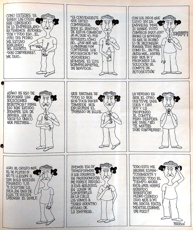 Al nivel de los cuadros a cargo, se advierte un esfuerzo por avanzar en la dinámica autogestionaria con el acompañamiento consciente del conjunto de los trabajadores “sin la influencia paternalista de unos pocos”55; rescatando que tanto la conformación del Comité de Autogestión como de las Mesas de Trabajo en las distintas secciones “significa que el poder de imaginar, crear y gobernar en la NUEVA EMPRESA no es patrimonio de una ‘elite’ SINO DE TODOS, ejecutando así el desarrollo de las responsabilidades a todos los niveles de la Comunidad de Trabajo” (SEGBA, 1973a: 156). Pero claramente el proceso presentaba sus dificultades y marchaba lentamente. La siguiente tira humorística sistematiza tanto las reticencias, planteos y sentires por parte de los trabajadores, como el ejercicio pedagógico por parte de la Subgerencia de Comunicaciones Internas de SEGBA destinado a “mentalizar” e incrementar los niveles de participación.