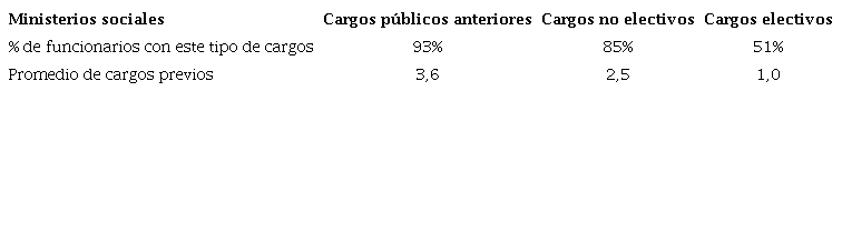 En lo que respecta a su ocupación de cargos públicos antes de llegar al puesto, los y las ocupantes de los ministerios sociales se encuentran en una suerte de punto intermedio entre lo observado para los ministros “económicos” y “políticos”. Al igual que ellos, la gran mayoría tuvieron algún tipo de cargo en el Estado (93%) antes de dirigir el ministerio, por lo que ya tenían cierta familiaridad con la administración pública, muchas veces en áreas de la misma incumbencia (en Educación, Justicia y Salud especialmente). Estos cargos fueron mayoritariamente no electivos (85%), si bien la mitad de estos ministros ocuparon antes puestos a los que accedieron mediante elecciones. El promedio de cargos no electivos es de 2,5 y el de cargos electivos es de uno por ministro. Así, su desempeño en contiendas electorales fue significativamente mayor al de los ministros de áreas económicas y menor al de los de áreas políticas.