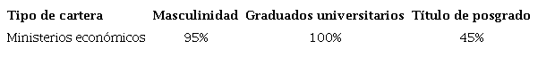 Los ministerios económicos muestran un tipo de reclutamiento específico que se distingue del resto del gabinete. Al calor del ascenso de los economistas y de la consolidación del saber económico como lingua franca en toda América Latina (Markoff y Montecinos, 1994), sobre todo en épocas de gran importancia de los organismos internacionales, sus créditos y condicionamientos desde fines de la década del 80, los expertos económicos estuvieron en franca mayoría en estos ministerios y acrecentaron progresivamente su visibilidad pública.