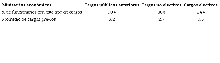 El promedio total de cargos públicos previos para estos ministros es de 3,2. Entre ellos, la marca mayor es la de Domingo Cavallo, el célebre ministro de Economía de Carlos Menem durante más de 5 años (1991-1996) y autor del régimen de convertibilidad entre el peso y el dólar. En su segundo paso como titular de ese ministerio durante los últimos 9 meses del gobierno de Fernando de la Rúa (2001), llegó a la cartera con 7 cargos no electivos y un cargo electivo en su haber.