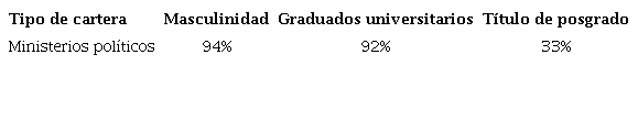 De este modo, aún con las características propias de cada cartera, en todos los ministerios “políticos” se destaca un reclutamiento signado por los numerosos cargos públicos y la regularidad de cargos electivos. Se trata de una mayoría abrumadora de hombres con larga pertenencia al mundo políticos, que conocen a sus participantes, sus reglas no escritas y sus criterios de eficacia.