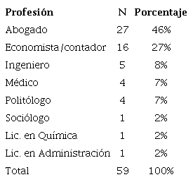 En lo que respecta a la distribución de profesiones de base, en estas carteras sobresale la clásica formación de los políticos profesionales identificada por Max Weber y replicada en todos los Estados modernos: el derecho. Casi la mitad de los responsables de estos cuatro ministerios fueron abogados (46%), seguidos por los economistas y contadores (27%), y luego por un heterogéneo conjunto de ingenieros, médicos, cientistas sociales, administradores y químicos. La dispersión de credenciales para acceder al cargo es mucho mayor que en los ministerios económicos, pero, como veremos, menor que en los variados ministerios sociales.