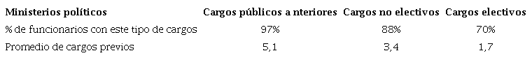 Pero más allá de las profesiones de origen, sin duda el elemento más distintivo en el reclutamiento de estos ministros respecto de todos los demás miembros del gabinete nacional es la relevancia de su carrera política previa. Como se observa en el siguiente cuadro, el 97% tuvo cargos públicos anteriores, e incluso el 7 de cada 10 ocuparon previamente cargos electivos.