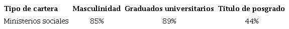 Esta variedad de tareas y públicos trae aparejada una importante variedad de perfiles ministeriales. Sus miembros son los que tienen menos credenciales universitarias, siendo el único tipo de cartera en que esos graduados se encuentran por debajo del 90%. De los y las ministras en funciones desde 1983, hubo nueve sin ningún título y dos maestras, con título terciario (Graciela Fernández Meijide, ministra de Desarrollo Social durante la gestión de Fernando De la Rúa, y Graciela Camaño, ministra de Educación de Eduardo Duhalde entre 2002 y 2003, que luego sería ininterrumpidamente diputada nacional y se recibiría de abogada por la Universidad de Morón en 2011). Tampoco sobresalen los estudios de posgrado (44%), si bien se constata una creciente especialización por temas y un notable aumento de estas credenciales en los últimos años. También en estas carteras es donde hay menor porcentaje de masculinidad: aún cuando sigue siendo alto, se encuentra 10 puntos por debajo del resto de los ministerios (85%). En este sentido, los ministerios sociales tuvieron más mujeres en su cúspide, la mayoría de ellas en la cartera de Desarrollo Social (7), pero también en Trabajo, Educación, Salud y Seguridad. Al igual que para el resto de América Latina, las mujeres están estadísticamente sobrerrepresentadas en los puestos estereotípicamente de “dominio femenino” (Escobar-Lemmon y Taylor Robinson, 2009: 690), pero sus carreras no se confinan a este tipo de carteras (Neira, 2017).