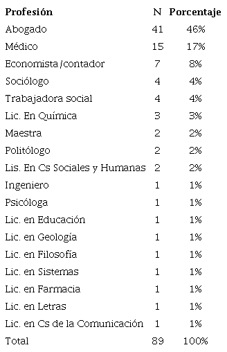 También es significativamente mayor la dispersión de las profesiones de base en estos ministerios. Los abogados constituyen el 41% del universo, seguidos por los médicos (17%) que se concentran -como es de esperar- en el Ministerio de Salud, y luego una amplia lista de profesionales en la que conviven economistas y contadores (8%), sociólogos (4%), trabajadoras sociales (4%), maestras, ingenieros, politólogos, etc.