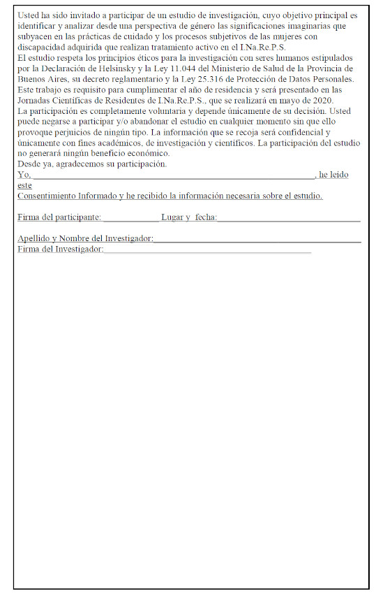 Para ello, se propuso identificar y analizar desde una perspectiva de género las significaciones imaginarias que subyacen en las prácticas de cuidado doméstico y los procesos subjetivos de dos mujeres con discapacidad adquirida que realizan tratamiento activo en el I.Na.Re.P.S. El tipo de muestra elegido corresponde a una muestra no probabilística, ya que les sujetos serán seleccionados a criterio personal e intencional del investigador. (Pimienta Lastra, 2000, p.265). Las mismas serán mujeres mayores de 18 años en situación de discapacidad adquirida y que se encuentren realizando tratamiento activo en I.Na.Re.P.S. Que puedan expresarse verbalmente, y que den su consentimiento informado para participar de la investigación.