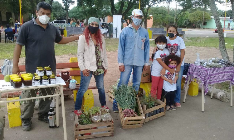 La feria (figura 3) es un proyecto que se encuentra impulsado principalmente por los/as productores/as, generalmente vinculados a AZCAM en relación con el INTA y la SAFCI. La primera se realizó con motivo del día de la lucha campesina el 17 de abril de 2021 y se continuó desarrollando una vez al mes aproximadamente en la plaza de Pozo Hondo, con proyecciones de ir rotando por diferentes comunidades. En la misma, los/as productores/as tienen la posibilidad de exponer y visibilizar sus producciones: dulces de conserva, escabeches varios, quesos, panificados, frutas y verduras, chacinados, artesanías en cerámica, tejidos y productos de cuero, entre otros.