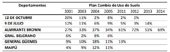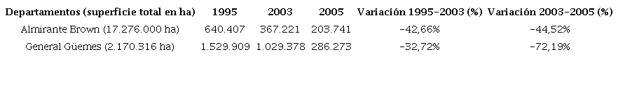 Cuando uno mira la totalidad de los procesos descriptos de doble valoración (agronegocio y turismo naturaleza) se encuentra con que la preservación de esta área natural y el reconocimiento de los derechos territoriales a poblaciones indígenas (Colla, 2018), en realidad, se combinan con cambios del uso del suelo en ambos departamentos y el corrimiento de la frontera agrícola cada vez más pronunciado, con mayor impacto en el departamento Almirante Brown. Como expresa Heredia (2017) “a medida que pasan los años la frontera agrícola, se expande hacia el departamento Almirante Brown y General Güemes, los departamentos que (...) concentran mayor superficie de bosques, y son los que a medida que pasan los años tienen mayor proporción de superficie afectada a los desmontes legales (plan de cambio de uso de suelo)” (Heredia, 2017: 60-61).