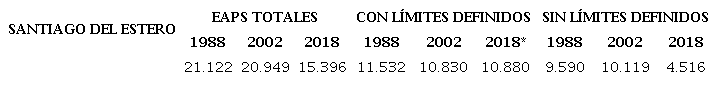 A partir del análisis de los censos agropecuarios de 1988, 2002 y 2018 (tabla 3), observamos una disminución de las Explotaciones Agropecuarias (en adelante EAPs) totales de 21.122 a 15.396. Teniendo en cuenta la división entre EAPs con y sin límites definidos5, observamos que los primeros mantienen la cantidad y las segundas, disminuyen notablemente pasando de 9.590 en 1988 a 4516 en 2018. Esto a la vez, revierte la tendencia de las EAPs sin límites definidos observada en el censo 2002 donde aumentaron respecto a 1988.