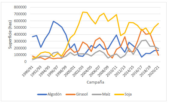 Las oscilaciones recientes en la producción algodonera se pueden observar en el cuadro 1, con su máximo valor a mediados de los años noventa y su crisis más pronunciada hacia 2001/2002. Por su parte, la producción de soja experimenta un fuerte crecimiento a finales de los noventa y comienzos de los 2000 para después, con oscilaciones, mantenerse en un nivel elevado. La superficie con girasol, por su parte, también presenta cambios y su mayor expansión se registra en 2016/2017 pero vuelve a caer en el 2021. El maíz es relativamente más estable, pero crece de forma marcada desde 2014 al igual que en otras zonas del país y para 2020/2021 alcanza la misma superficie que el algodón (Cuadro 1).